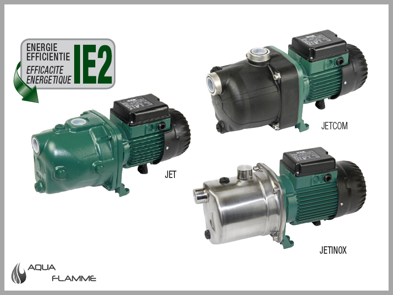Pompe centrifuge auto-amorçante ayant d’excellentes capacités d’aspiration même en présence de bulles d’air. Particulièrement indiquée pour l’alimentation en eau dans les installations domestiques, la petite agriculture, le jardinage et, en général, là où la fonction d’auto-amorçage est nécessaire. Jet: corps de pompe en fonte. Jetinox: corps de pompe en acier inoxydable. Jetcom: corps de pompe en technopolymère. Support moteur en fonte ou en aluminium, roue, diffuseur, tube venturi et garniture antisable en technopolymère. Bagues de régulation de niveau en acier inoxydable. Garniture mécanique en carbone/céramique. Moteur de type asynchrone, fermé et refroidi par ventilation extérieure. Protection thermo-ampèremétrique incorporée et condensateur permanent incorporé dans la version monophasée. Pour la protection du moteur triphasé, il est conseillé d’utiliser un coupe-circuit à distance conformément aux normes en vigueur.